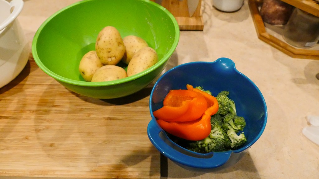 Peel and dice potatoes set them to the side. Wash and cut long strips of the bell pepper.Wash and cut broccoli in small florets.
