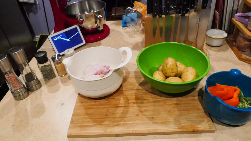 For the potatoes, put them in the oven at the same time as the chicken and leave them for 25 minutes then broil on low for three minutes at the end.